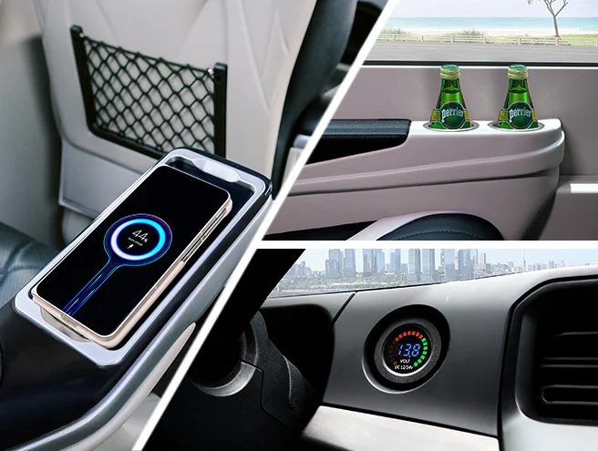 Nhiều hộc tiện ích cá nhân, cùng với cổng sạc điện thoại, hệ thống phát wifi, đèn đọc sách.