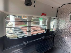 Vách ngăn giữa khoang lái và thùng hàng làm bằng Alu – khung thép 3 lớp chịu lực, có thiết kế cửa sổ phụ.